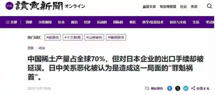 如果说前两记重拳是军事上的硬碰硬,那么第三记则是经济上的“精准点穴”。据日本《读卖新闻》2025年12月7日报道,多位不愿具名的日本政府官员透露,中国对部分输日稀土产品的出口审批流程出现明显延迟,耗时远超历史平均水平。对此,中国外交部发言人郭嘉昆回应称:“中方主管部门正依法依规处理有关问题。”